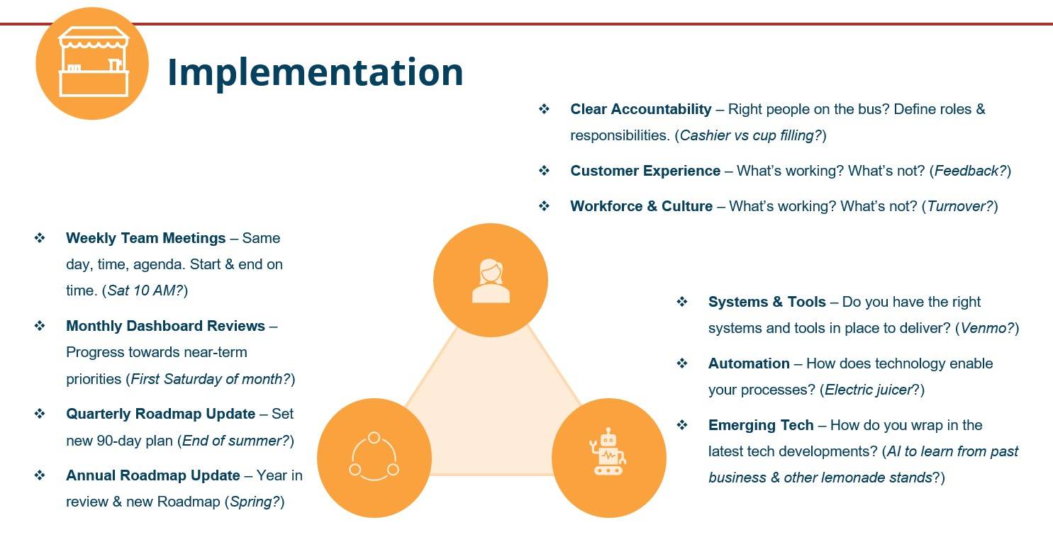 2. The Strategy Made Simple Method This article is the 7th in a series exploring the Strategy Made Simple Method through the lens of a lemonade stand. If you haven’t already, check out the previous articles here. Today, we will explore the lemonade stand’s implementation. People, Process, & Technology Implementation is where the rubber meets the road. Just like owning a violin doesn’t make you a violinist, a strategy isn't enough. You must engage with it, practice, learn, and adjust over time. Implementation embeds your strategy into operations through people, processes, and technology. People In his book Good to Great: Why Some Companies Make the Leap and Other’s Don’t, Jim Collins popularized the notion of having the right people “on the bus” to build a truly great company and focusing on the “who” first then the “what.” Do you have the right people on the bus? Have you clearly defined roles and responsibilities for clear accountability? How are you driving customer experience to capture to determine what’s working, what’s not, and what needs to change? If you hire employees, you will want to consider your workforce, culture, and how you incentivize the new behavior you want to see. Figure out who you want on your bus and then make it happen. Process Process includes a cadence that you can implement over the course of the year. It starts with weekly team meetings that occur on the same day, at the same time, with the same agenda, and start and end on time. Next are monthly dashboard reviews to gauge progress towards your near-term priorities. These are followed by a quarterly roadmap update to review the last ninety days and set a new ninety-day plan. Finally, there is an annual roadmap update to review the year and set new annual goals and the ninety-day plan. Technology Technology includes the systems, infrastructure, tools you have in place to deliver your products and services. It includes everything from payment systems to automation in your internal sales processes to the latest AI virtual platform to connect your team. 3. Pulling it All Together 4. Application So, what does it look like for your business?